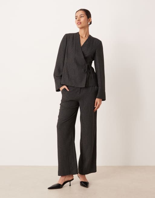 AWARE tie side tailored blazer and clean wide leg pants set in dark grey melange