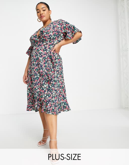AX Paris Plus wrap midi flutter sleeve dress in dark floral