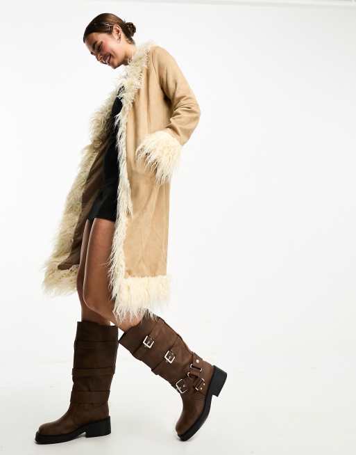 Bailey Rose longline 70s mocha faux suede fluffy trim coat