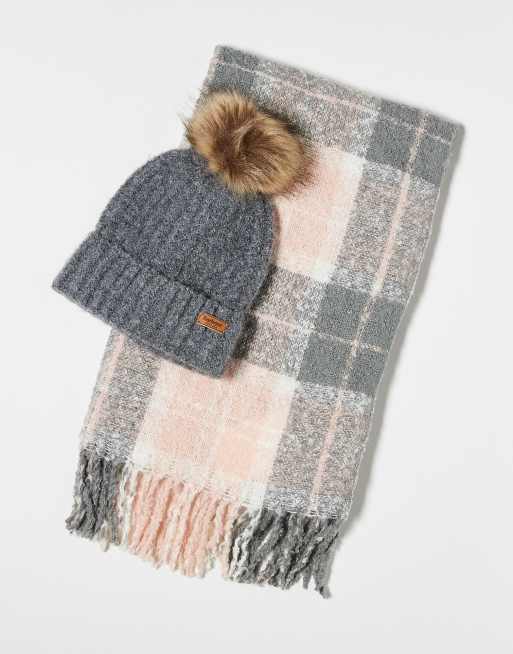 Barbour Saltburn beanie & tartan scarf gift set in grey rose