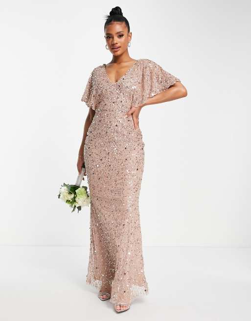 Beauut Bridesmaid all over embellished flutter sleeve dress in taupe