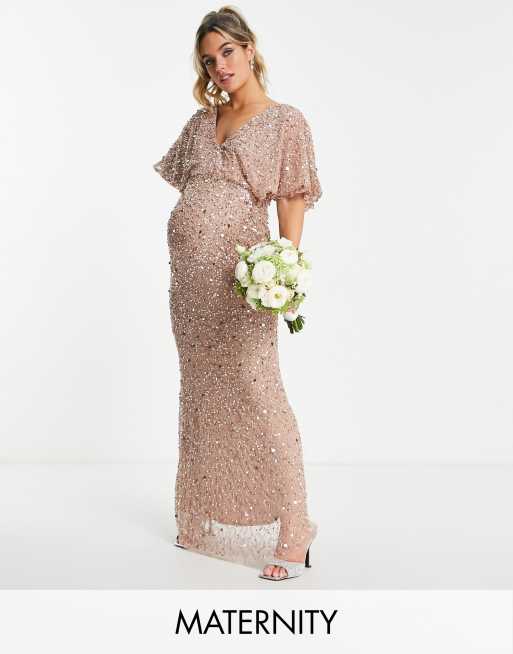 Beauut Maternity Bridesmaid allover embellished flutter sleeve in taupe