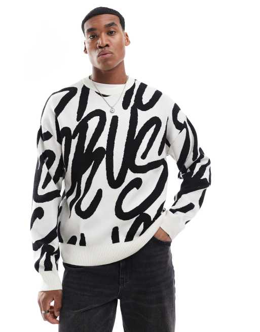 Bershka crush all over print knitted jumper in white
