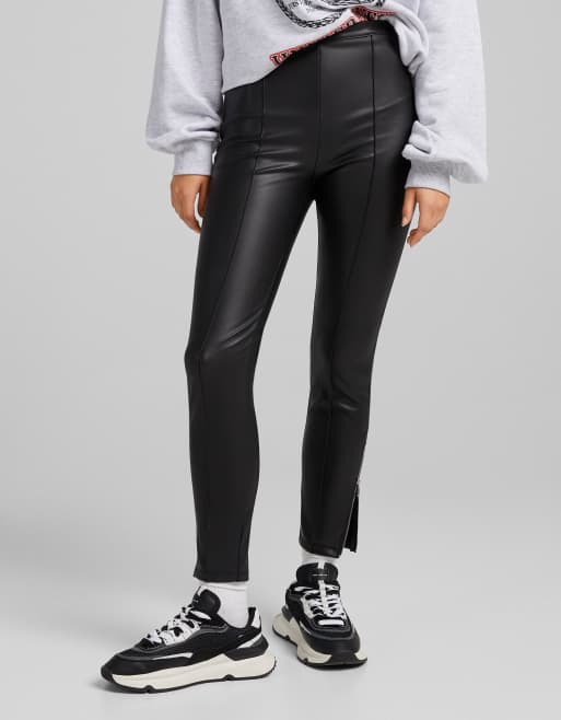 Bershka faux leather skinny pants with zip hem in black