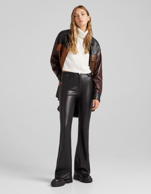 Bershka flare faux leather pants in black