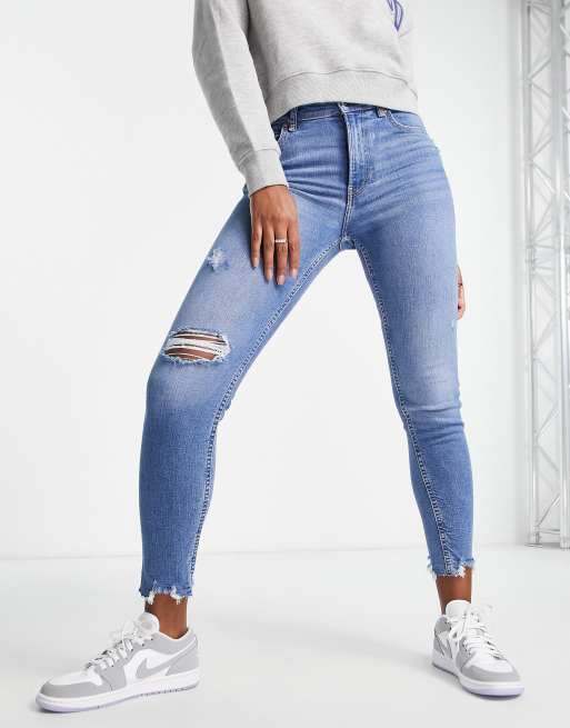 Bershka low waist skinny jeans with rips in medium blue