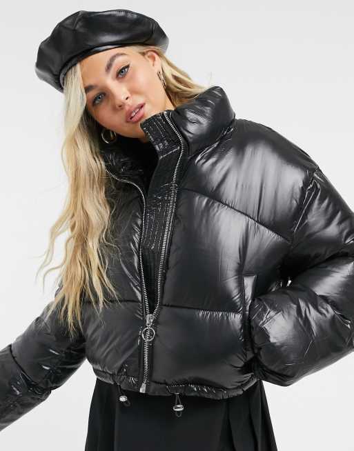 Bershka shiny padded puffer jacket in black