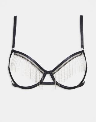 Bluebella Antoinette silver diamonte tassle open cup bra in black