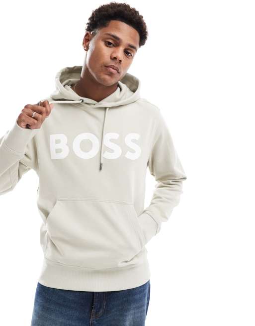 BOSS Orange basic pullover hoodie in light beige with logo print