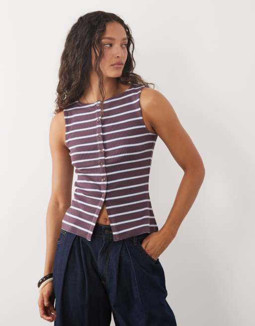 Brave Soul button down singlet in burgundy and blue stripe