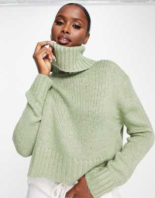 Brave Soul Cattio boxy cropped roll neck jumper in sage green