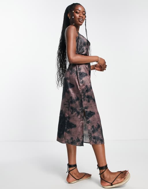 Brave Soul cowl neck satin midi dress with side slits in brown