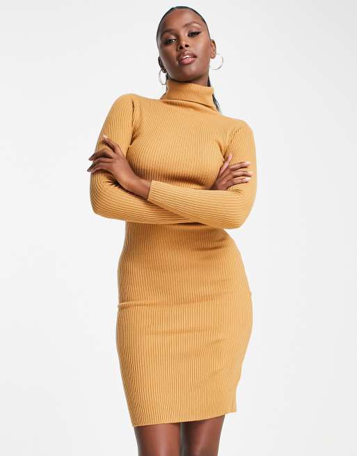 Brave Soul Juliet high neck knitted jumper dress in camel