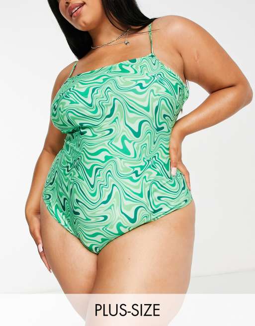Brave Soul Plus square neck swimsuit with adjustable straps in green swirl print