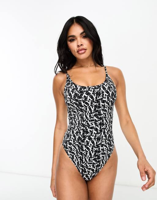 Calvin Klein monogram print scoop swimsuit in black