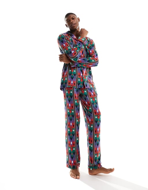 Chelsea Peers long button pyjama set in red and blue fair isle geo stripe