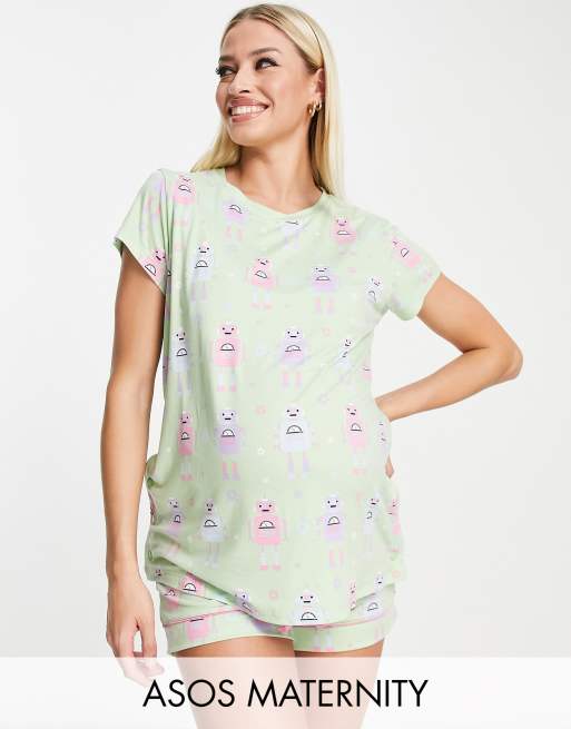Chelsea Peers Maternity short pyjama set in light green robot print