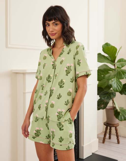 Chelsea Peers poly short sleeve revere shirt and shorts set in cactus pirnt