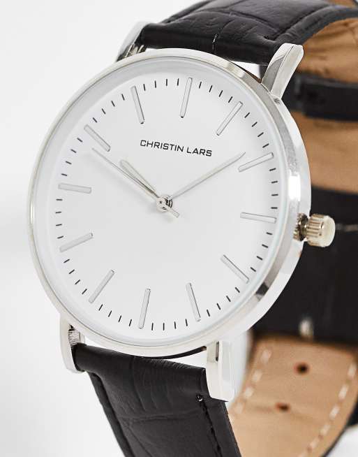 Christin Lars mock croc strap watch in black and silver