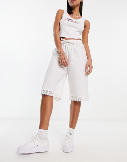 COLLUSION cotton poplin lace trim 3/4 length shorts in white