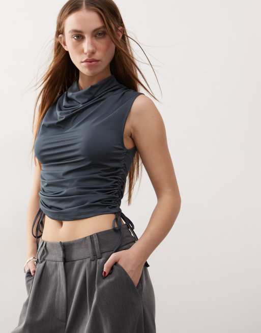 COLLUSION cowling drape detail slinky tank top with ruched side in slate grey