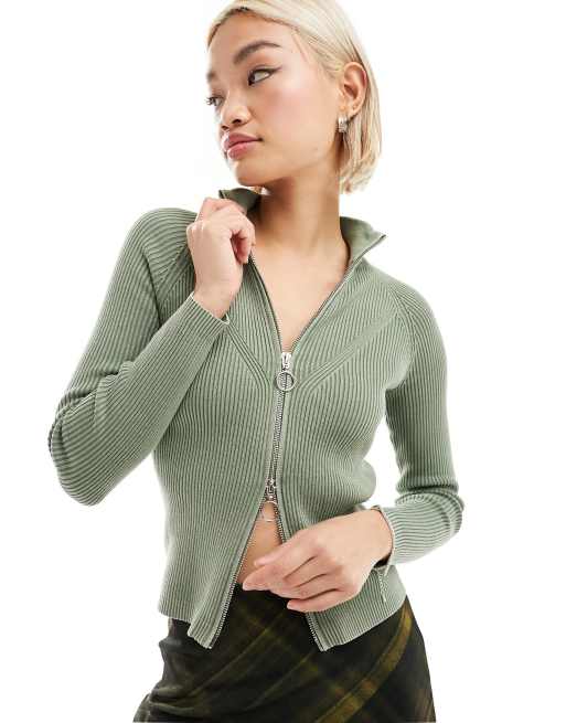 COLLUSION knitted double edge zip track top in washed khaki