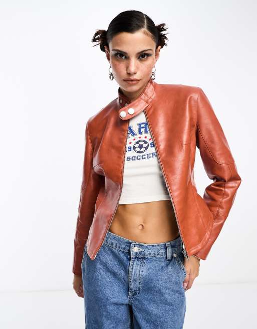 COLLUSION motocross faux leather cropped biker jacket in burnt orange