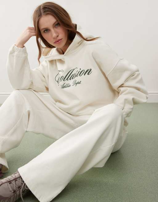 COLLUSION relaxed washed embroidery hoodie in ecru