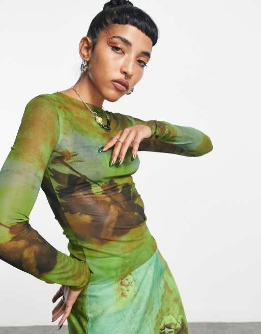 COLLUSION slash neck printed mesh long sleeve top in green