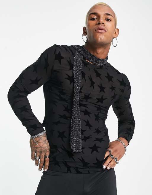 COLLUSION star flock mesh long sleeve top in black