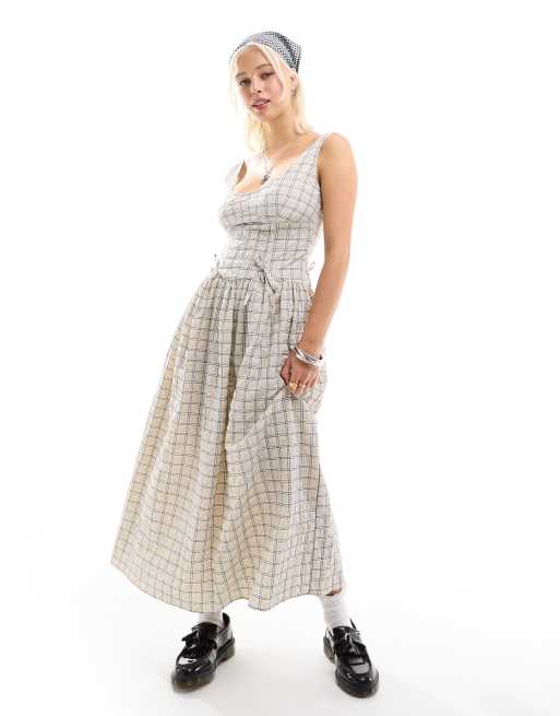 COLLUSION tie detailed smock midi dress in camel check