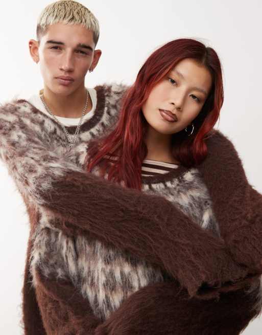 COLLUSION Unisex brushed oversized fair isle jumper in brown
