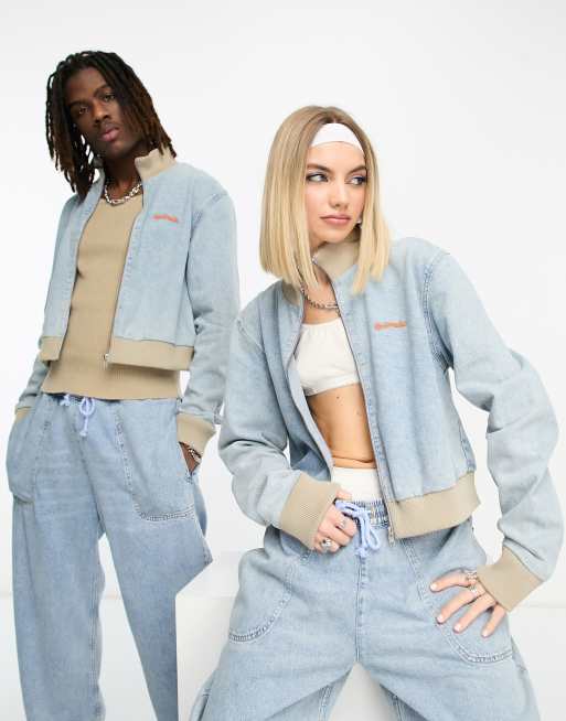 COLLUSION Unisex cropped denim bomber jacket with stitched branding in light blue (part of a set)