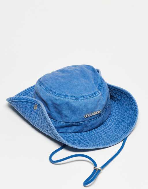 COLLUSION Unisex festival washed denim bucket hat with string in blue