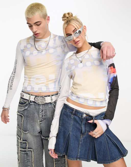 COLLUSION Unisex long sleeve placement print t-shirt in white