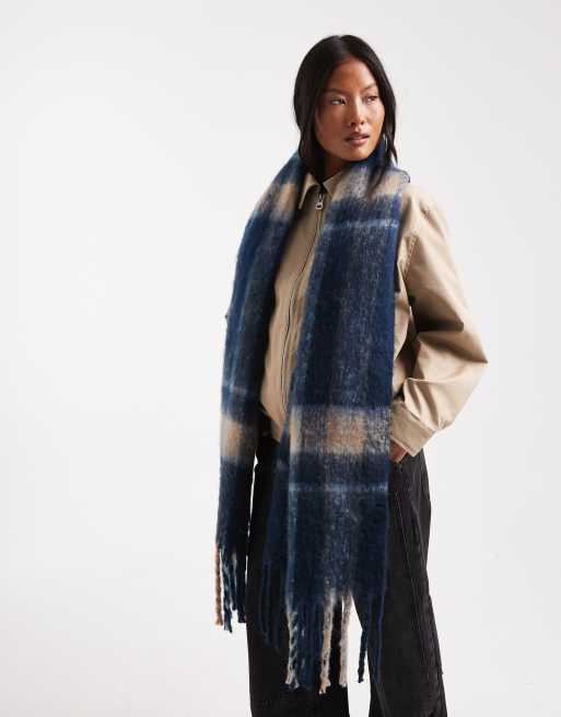 Cotton On Phoebe brushed tassel scarf in celeste check oxford navy