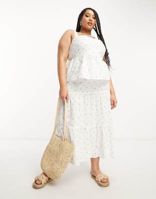 Daisy Street Plus linen tiered midi skirt in white ditsy floral