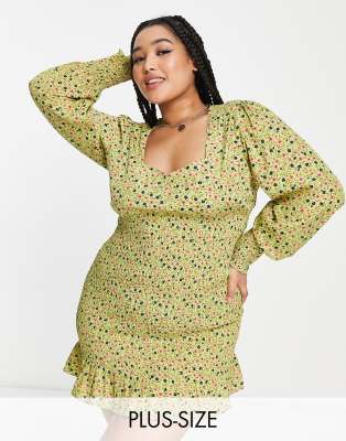 Daisy Street Plus square neck shirred mini dress in khaki ditsy