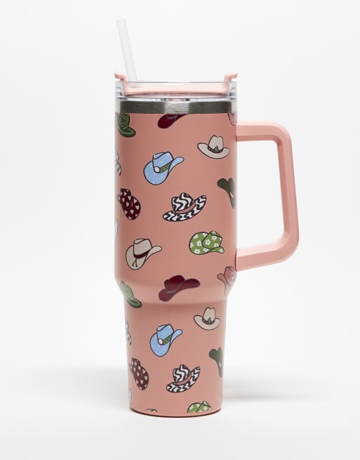 Daisy Street cowboy print re-usable drinking cup with handle and straw