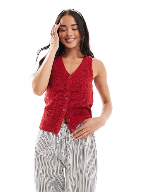 Daisy Street knitted v neck singlet with pockets in red