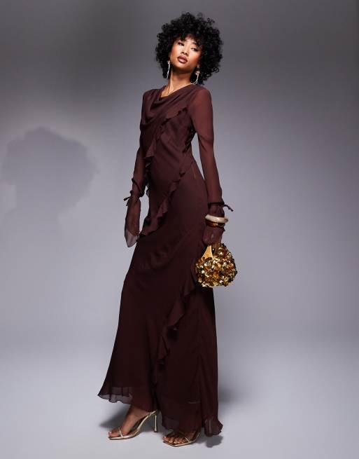 Daska chiffon ruffle maxi dress in chocolate brown