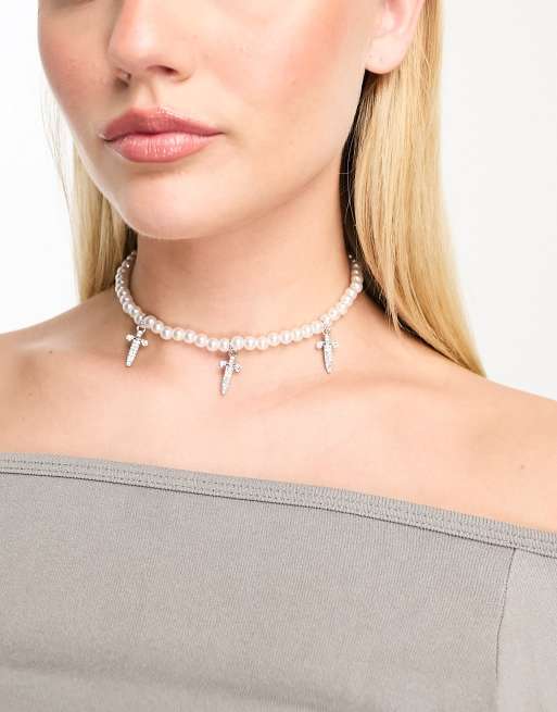 DesignB London pearl and dagger necklace in silver