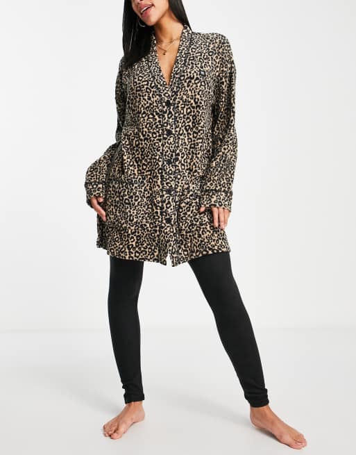 DKNY lounge stretch fleece cardigan and leggings set in brown animal