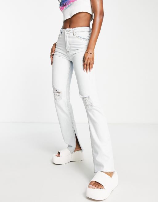 DTT straight leg jeans with raw hem and side split in blue