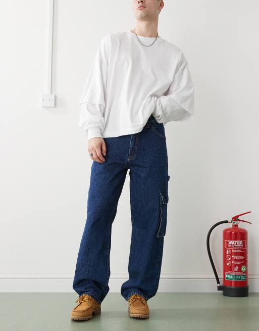 Dr Denim Colt Worker Cargo baggy fit mid waist wide leg jeans with workwear detail in stream dark retro