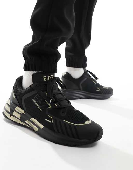 Armani EA7 gold logo flyknit nylon mesh sneakers in triple black / gold