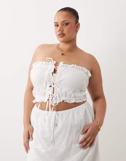 Esmee Curve tie front bandeau broderie crop top in white