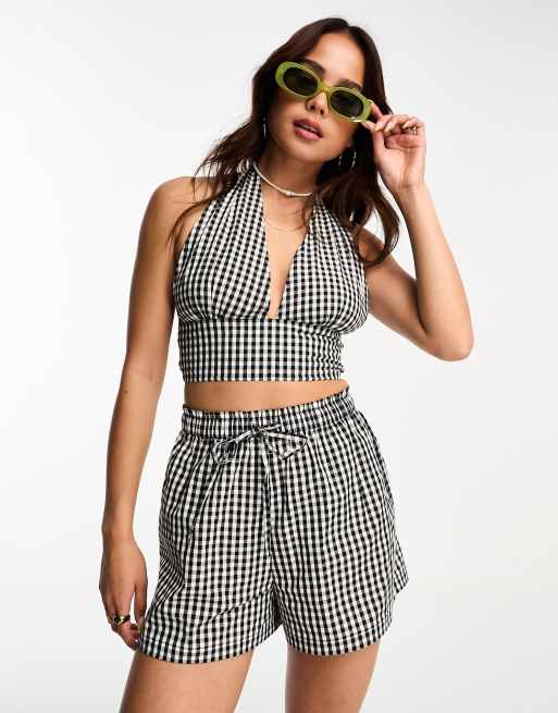 Esmee Exclusive beach shirred waist shorts in black and white gingham (part of a set)