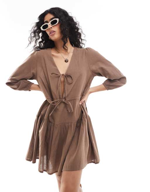 Esmee Exclusive linen mix long sleeve tiered mini tie front beach dress in brown