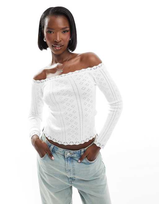 Fashionkilla pointelle lace trim bardot top in white